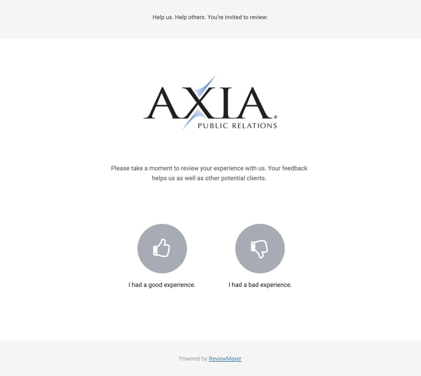ReviewMaxer, Axia Public Relations’ online review management software that monitors, collects, and promotes online reviews, now offers additional layout options for the review funnel function. The new design, page header, and brand color options help companies further customize their review funnels. Place this review funnel on your website to systematically drive happy customers to the review sites you value and guide unhappy customers to a service recovery that allows them to leave feedback that will assist other potential customers.