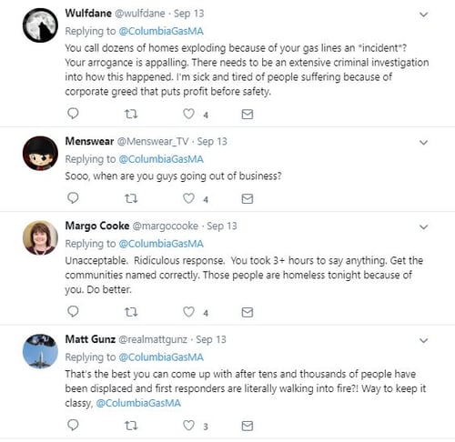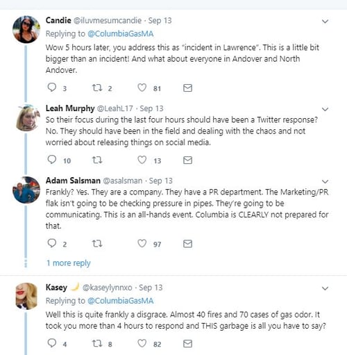 Columbia Gas provided no statements or reassurances for hours after the explosions. The benefit of social media is that a company can rapidly distribute information during a crisis. Columbia Gas missed the mark by going silent and infuriated frightened customers. Had it not been for the local news media, thousands in the area would have been ignorant as to why numerous highways and exits were closed and traffic built up for miles.