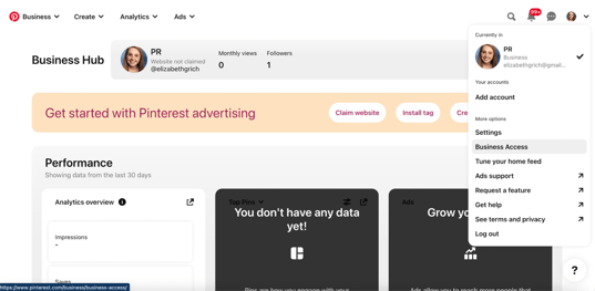 This account looks a little different than most companies on Pinterest because there isn’t much information added. When you find a chance, make sure to add any information about the company to help your page. To find business access, click the arrow next to the profile picture in the upper right-hand corner. This will drop down a menu where you can select Business Access.
