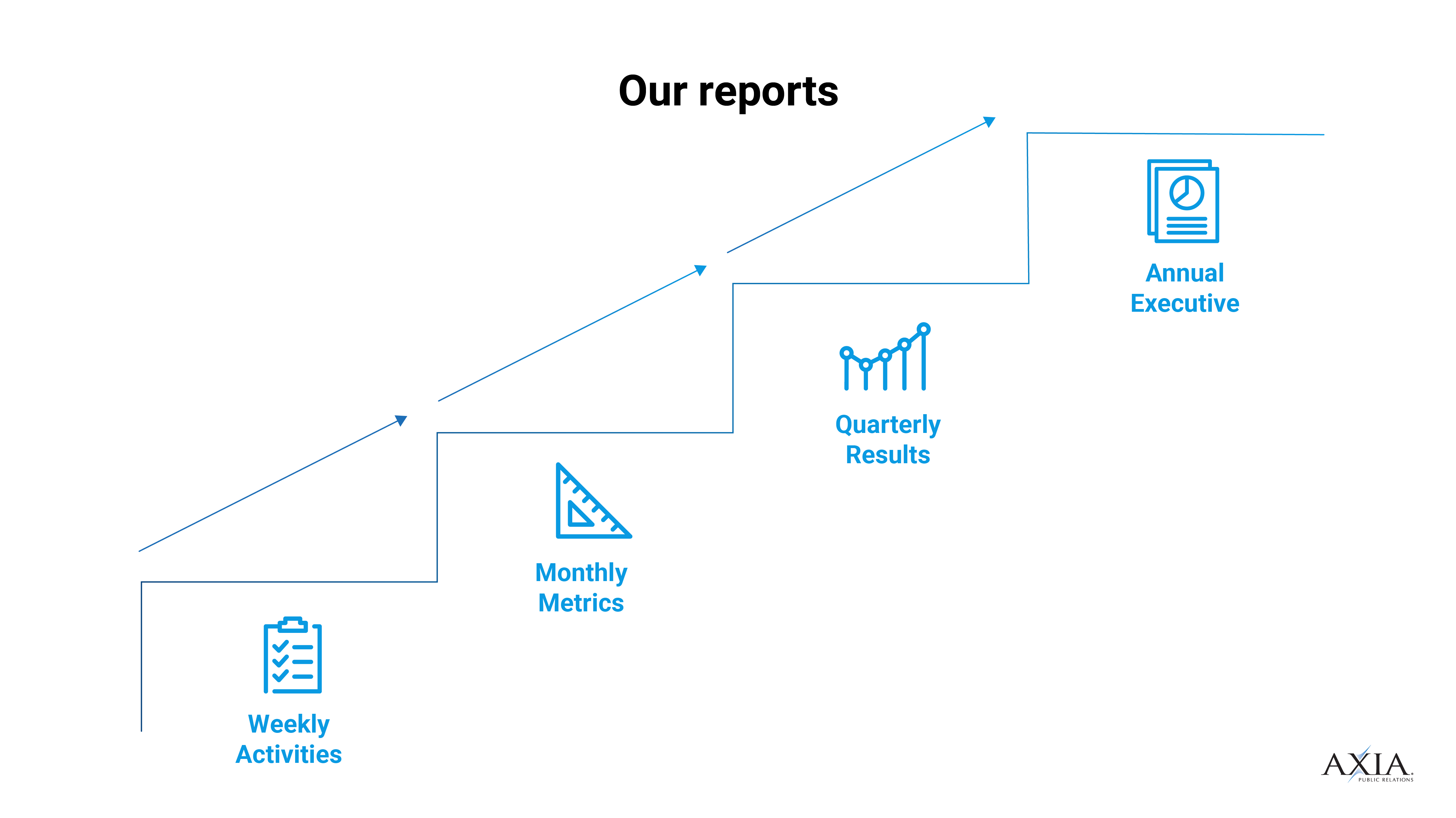 Most PR firms and departments report as frequently as quarterly. Some report as frequently as monthly. Axia Public Relations reports progress each week, month, quarter, and year because regular communication assures our clients that we’re actively developing results for them.