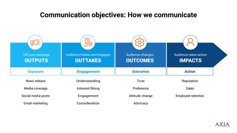 | Outputs - Tell your message | Outtakes - Audience's reaction | Outcomes - Behavior effects | Impacts - Direct company impact |