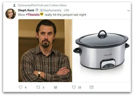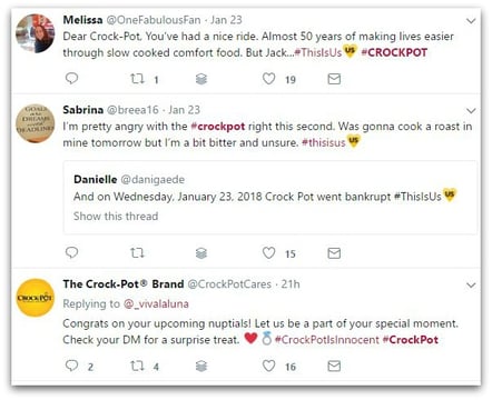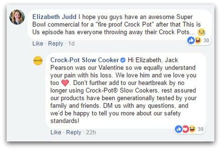 Social media is a direct link to customers and a way to highlight news and product wares as well as engage. Crock-Pot’s team did just that and did so with personality. The comforting, professional and thoughtful responses calmed the public and humanized the company. An “all-business” response likely wouldn’t have had the same effect and may have even fueled the fire (no pun intended). Even “This Is Us” creator Dan Fogelman used humor to connect.