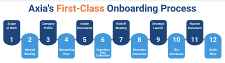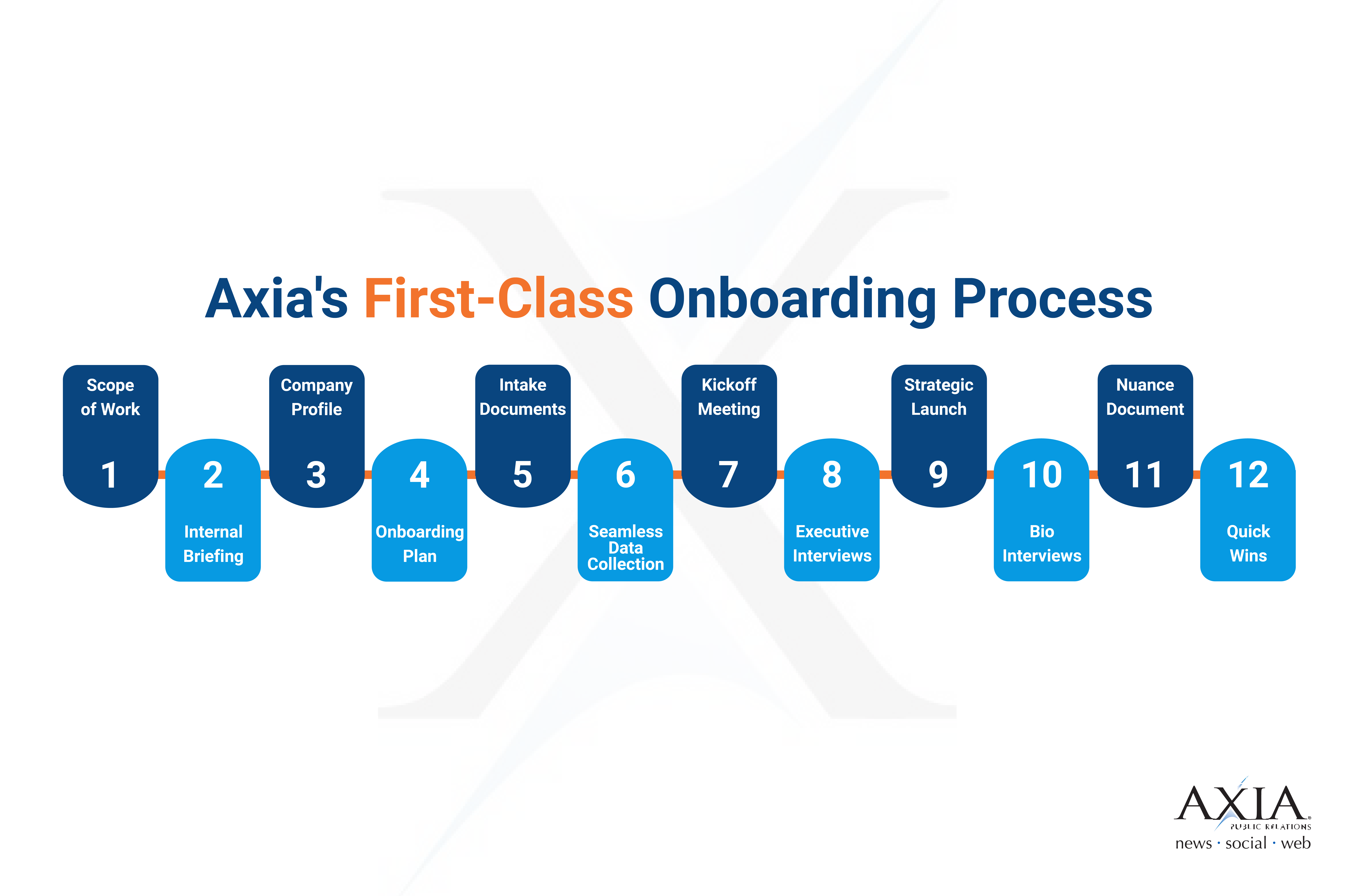 Onboarding processes can set the tone for your long-term success. As part of Axia’s Client Success Roadmap™, our first-class onboarding process is designed to ensure every new client feels confident, supported, and informed from day one. We guide you through a 12-step strategy that helps us achieve impactful public relations results.