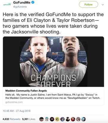 Encouraging community support and unity were important messages for Jacksonville during this tragic situation. More than 600 people came to The Jacksonville Landing for a service held by First Baptist Church of Jacksonville three days after the incident. The Jacksonville community rallied to support the gamer community and to show unification after the tragedy.