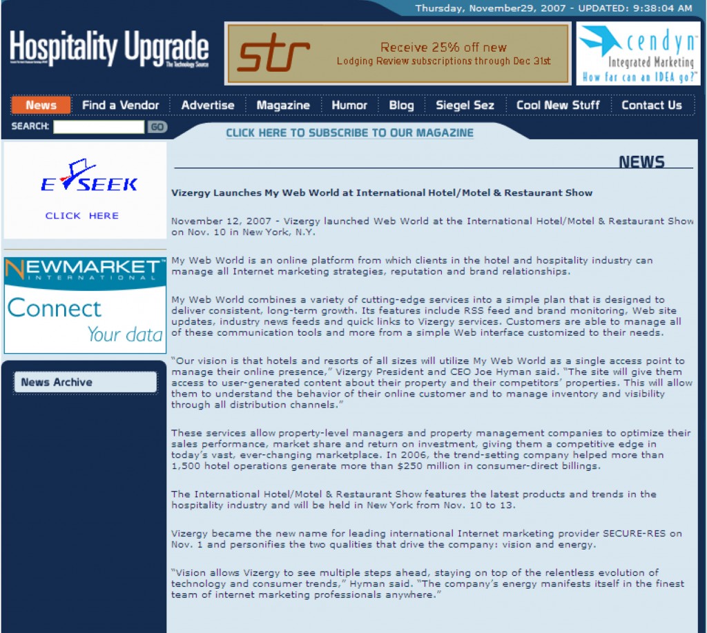 As part of the launch, Vizergy needed Axia’s public-relations expertise to help raise awareness and increase visibility for the new name and a new online product. Axia implemented a four-month PR campaign that included a new product launch in New York City at the HX: The Hotel Experience (formerly International Hotel Motel and Restaurant Show (IHMRS)).