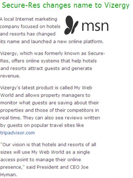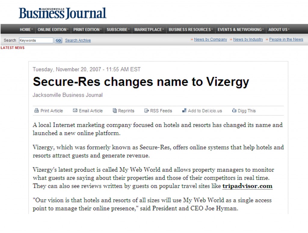 Secure-Res, an e-commerce booking engine for independent, smaller-chain and franchise hotels turned hotel web-marketing company, contacted Axia Public Relations for a rebranding strategy that would help to better represent the growing company and its expanding products and services. Through Axia’s branding process, Onoma, Axia renamed the company Vizergy and Secure-Res became its signature and productized service.