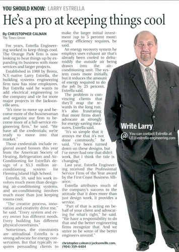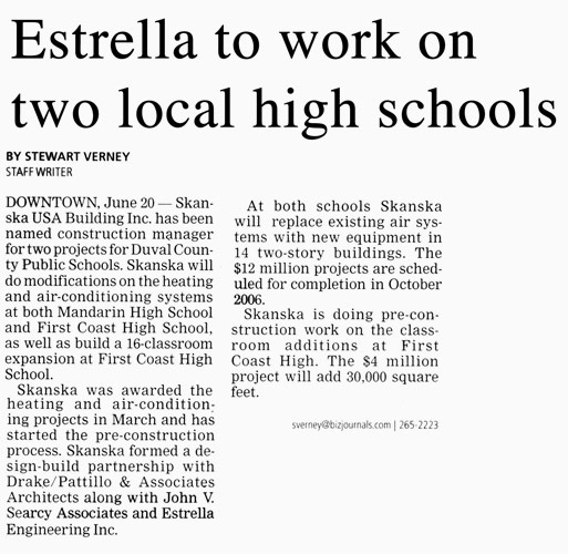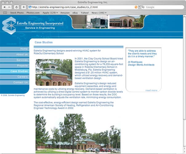 A PR firm with a conflict referred Estrella Engineering, a mechanical engineering firm, to Axia Public Relations for help in increasing its revenue. Axia developed a targeted direct-response program throughout the southeast United States to reach the top prospective clients. By positioning the professionals at Estrella as “subject-matter experts,” Axia earned media coverage in industry and target geographic news outlets, including a half-page, full-color profile of Larry Estrella in The Florida Times-Union, the prominent daily newspaper serving its target geographic market, and other business and industry news stories detailing the firm’s projects.