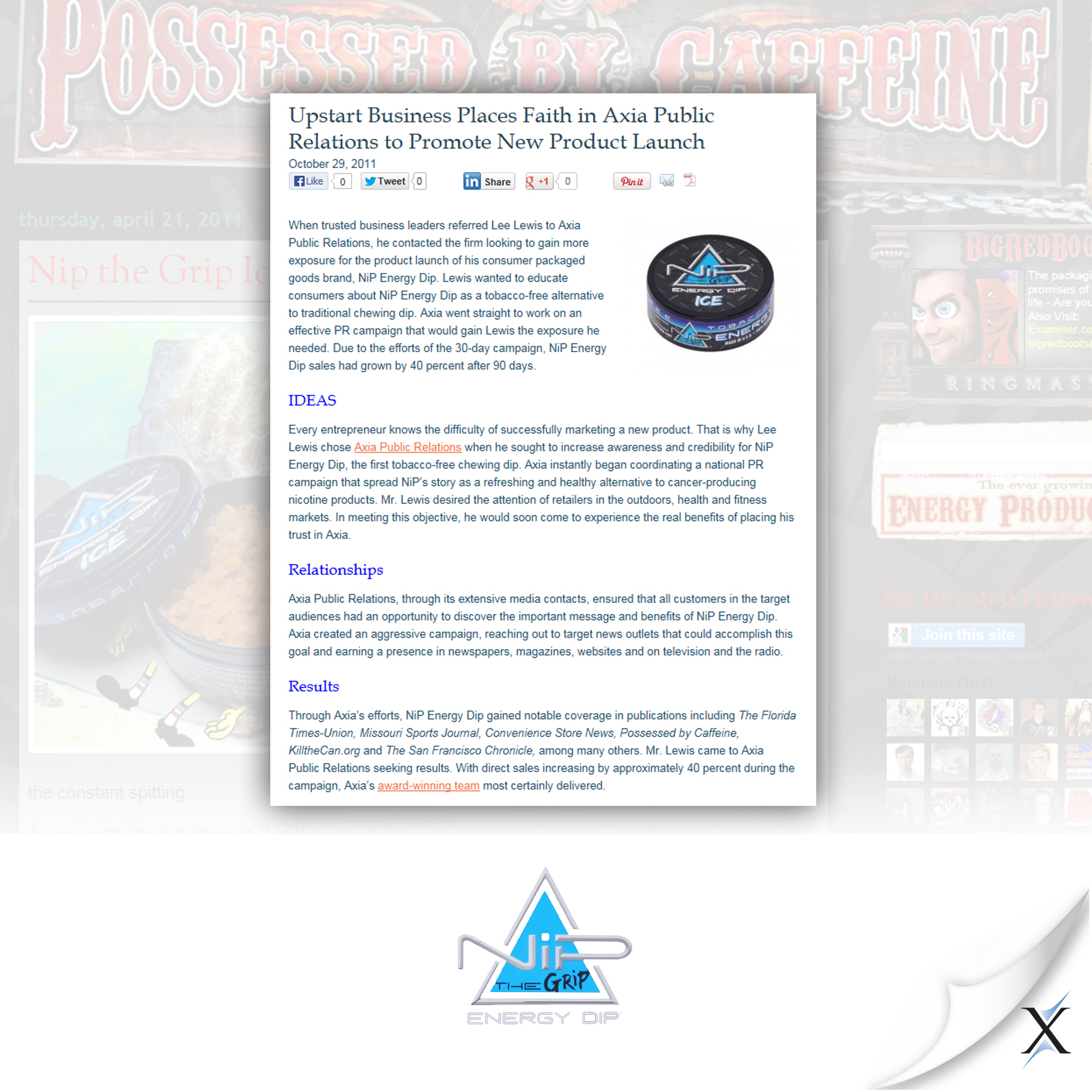 Lee Lewis hired Axia to educate consumers about NiP Energy Dip as a tobacco-free alternative to traditional chewing dip. Axia ran an effective PR campaign, gaining media exposure and helping attract retailers that would carry the product. Sales increased by approximately 40% during the campaign.