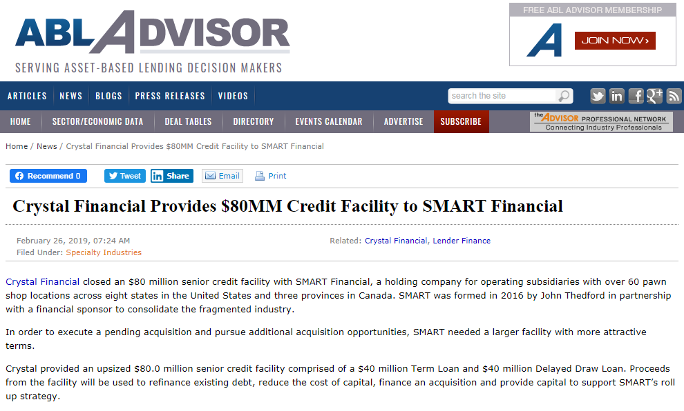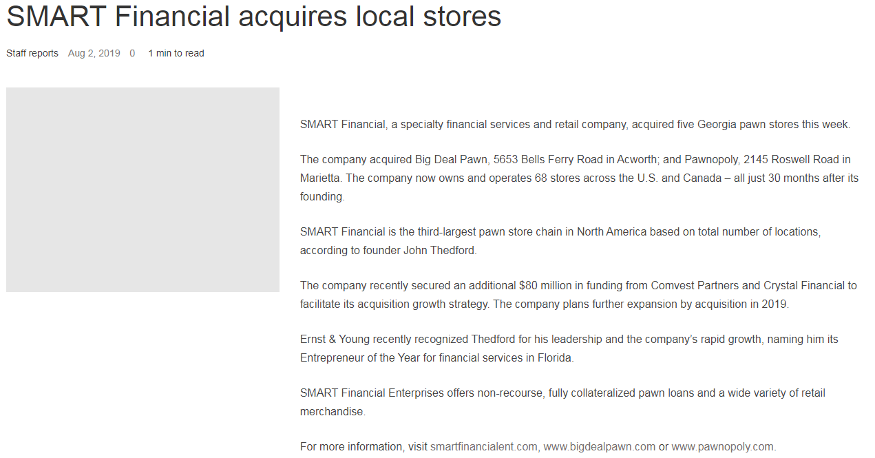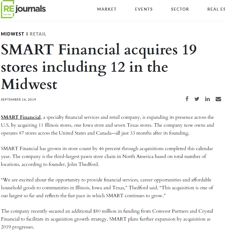 SMART Financial grew rapidly from day one and wanted to share its meteoric expansion. As one of the most successful leaders in the industry, Thedford knew that changing the public perception of the pawn industry would help attract the best employees to his stores across North America, which would attract the best customers. With better customers, he'd enjoy increased sales and attract investors to acquire, integrate, and improve more stores.