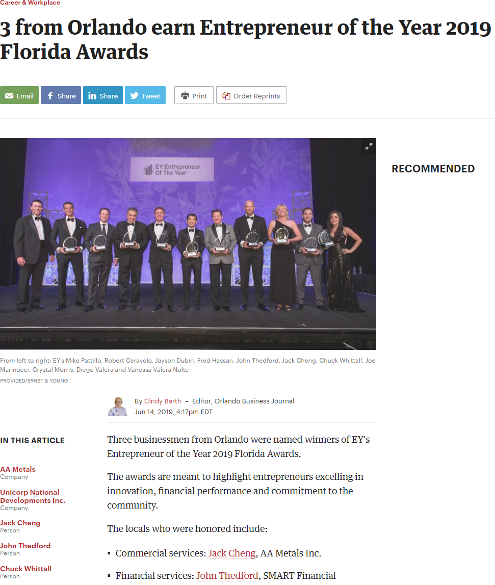 - Awarded Ernst & Young's Florida Entrepreneur Of The Year