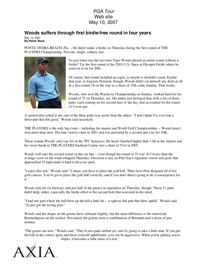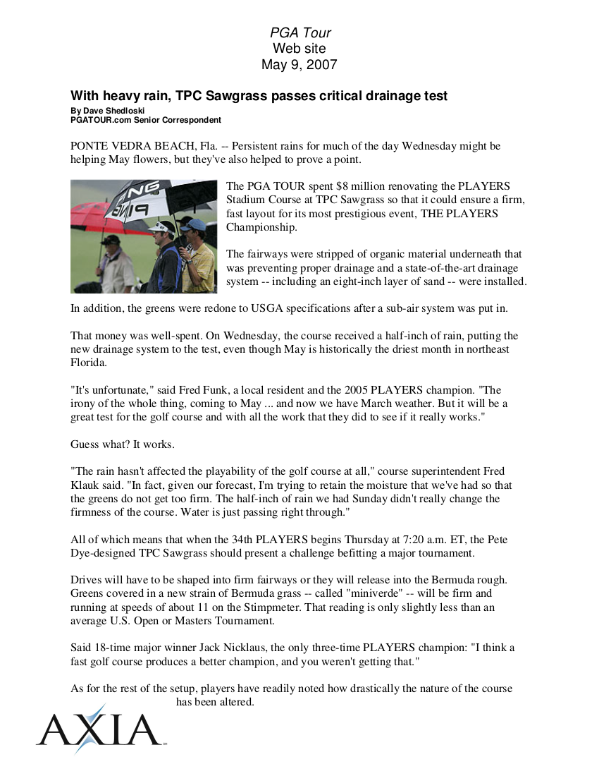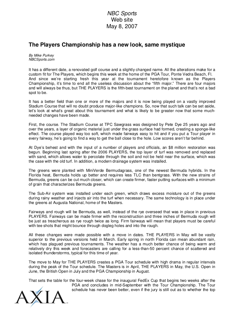 With a small budget and a timeframe tighter than the Sawgrass fairways, within 30 days Axia earned numerous on-air mentions by NBC Sports as well as earning media coverage in print, radio, TV and online, including Golf World, PGATour.com, ABC and NBC news affiliates, The New York Sun, and several more.