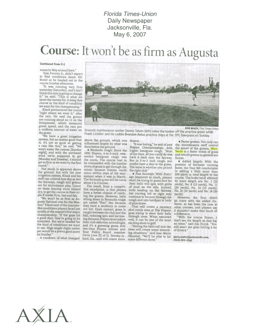 Turfgrass America sought Axia’s help to enhance awareness about MiniVerde's design to recover from stress quickly and create interest in using MiniVerde among greenskeepers, golf course superintendents and golf fans. Axia recommended that public relations could achieve maximum results on a minimum budget instead of a more expensive and last-minute advertising or sponsorship campaign, which the client was considering.